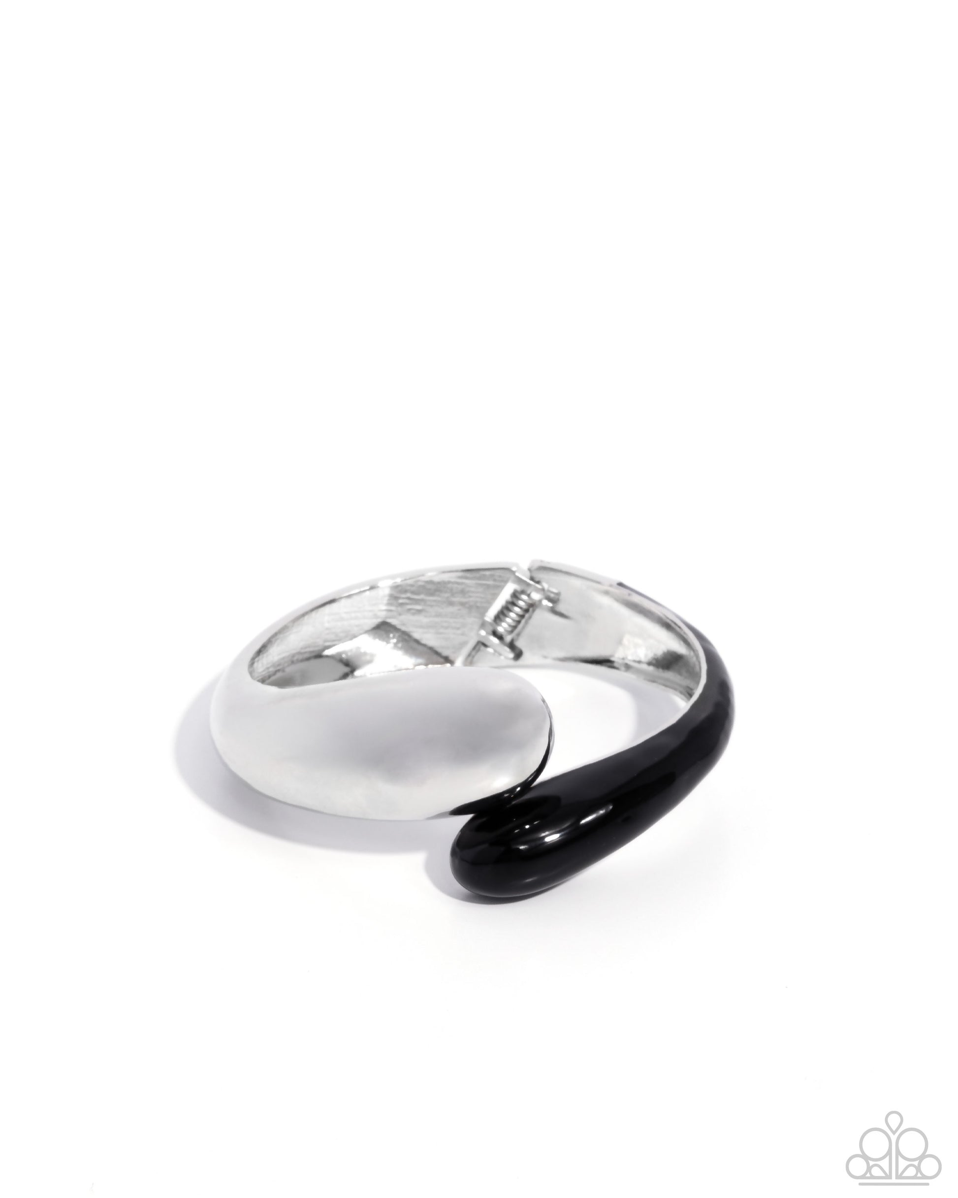 A sleek bangle-like design is accented with a smooth black-painted finish on one side, while the other reflects light off a smooth silver finish. Features a hinge closure.