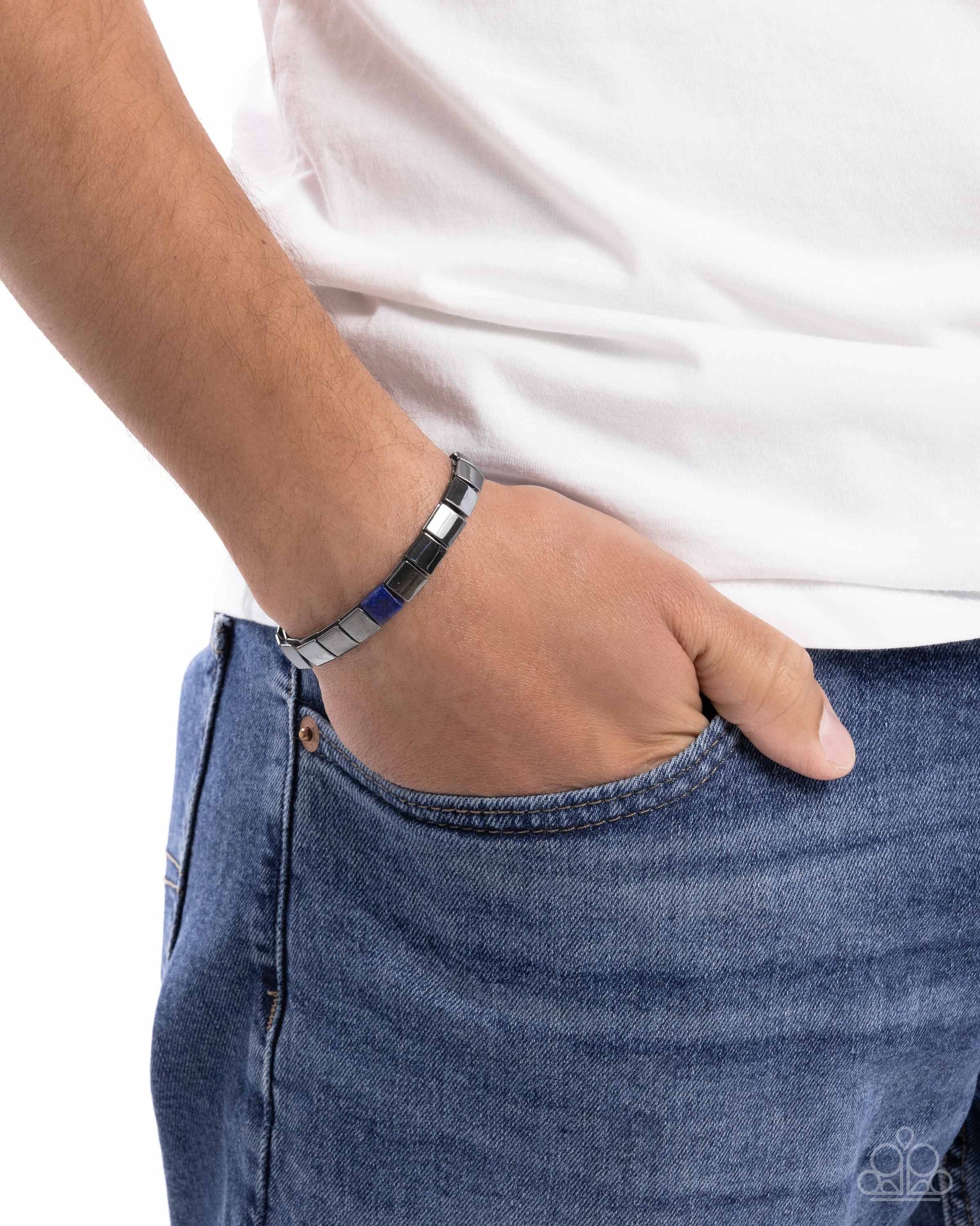 Infused along elastic stretchy bands, a collection of squared lapis stones are sporadically dotted alongside sleek gunmetal square beads for an unrivaled urban display. As the stone elements in this piece are natural, some color variation is normal.